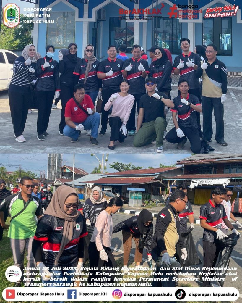 Dinas Kepemudaan olahraga dan Pariwisata Kabupaten Kapuas Hulu mengikuti aksi bersih pada Jumat pagi 25 Juli 2025. Kegiatan tersebut dilaksanakan dalam rangka menyambut lawatan Permanent Secretary Ministry of Transport Sarawak ke Kabupaten Kapuas Hulu yang direncanakan pada tanggal 29 sampai dengan 30 Juli 2025.